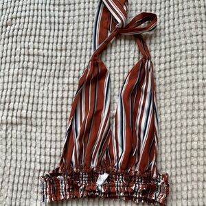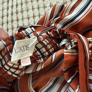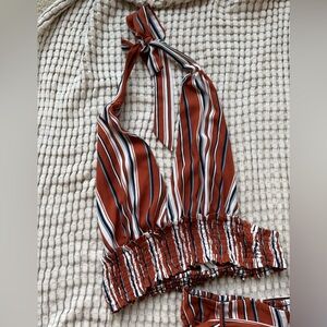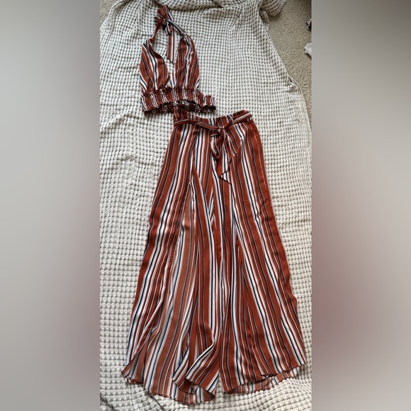 Two piece set. Crop top with flowy bottoms. The bottoms have slits on the sides. Very comfortable. Both pieces are a size large