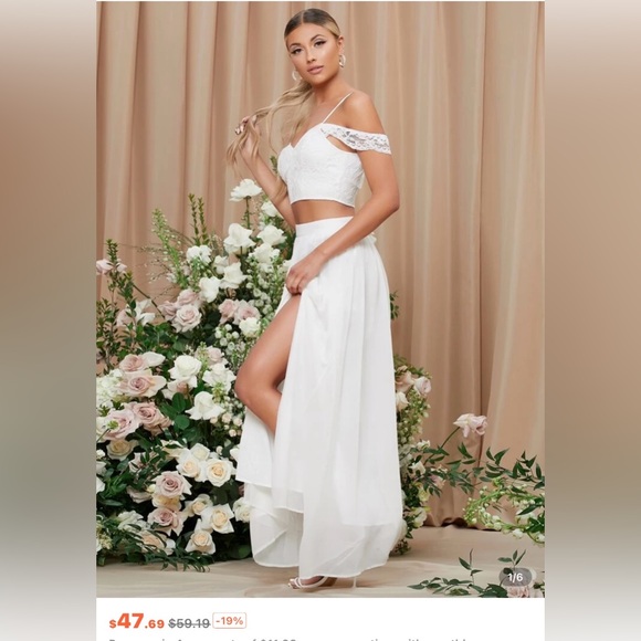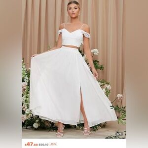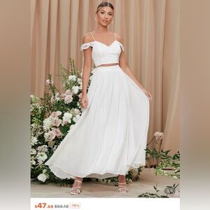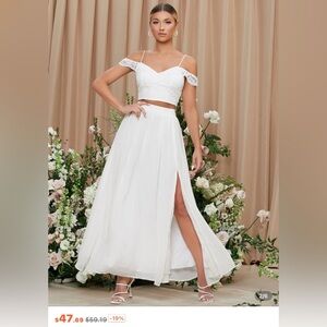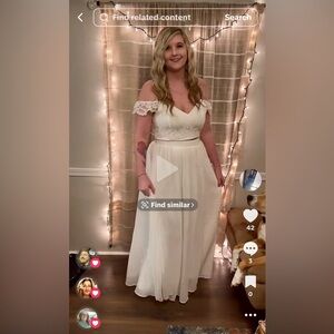 Perfect condition, only tried on and wore during a TikTok video 😂 Absolutely STUNNING dress. I left the price at the bottom of the photos so you can see what I paid for it, not including shipping. This is so worth it! Two piece set perfect for bridal shower or bridal photos! You can wear this to the beach or a big event as well. The last photo shows me wearing it.