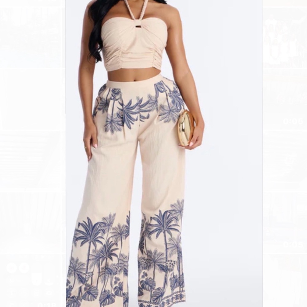 Cream high-rise wide-leg pants featuring an all-over navy palm tree print with top. Lightweight, breathable fabric for easy movement. Elasticized waist for a comfortable fit. Stylish tropical motif adds vacation-ready flair. Pairs well with heels or flip flops.