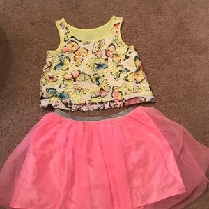 Floral top and pink tutu style skirt with silver waist band. Perfect for Easter or anytime you wan to doll her up.