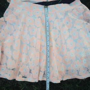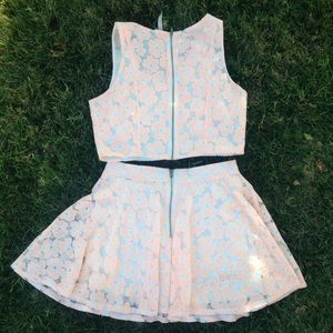 Beautiful two piece outfit with crop top and high waisted shirt. Lovely pinkish flower print design. Great for special occasions. Only worn once to a wedding. Both shirt and shirt are a size medium.