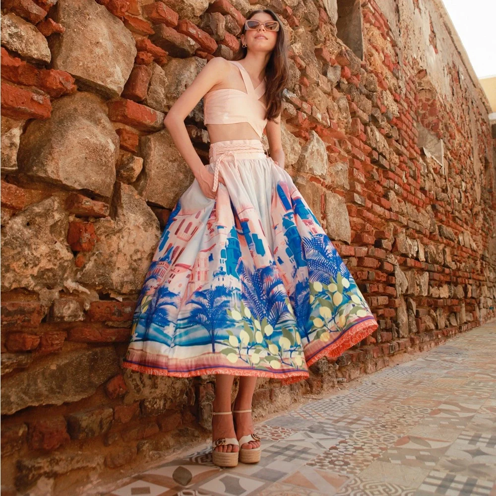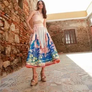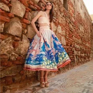 Set two pieces, crop top sweetheart neckline with thick adjustable straps in the back, removable zipper, structured midi skirt, waistband, hidden zipper and braided belt.