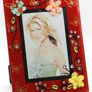 Two sets of Beautiful Red Glass 4" x 6" Photo Picture Frame with Flowers and Butterflies gift for him her anniversary gifts Display Tabletop Frames.