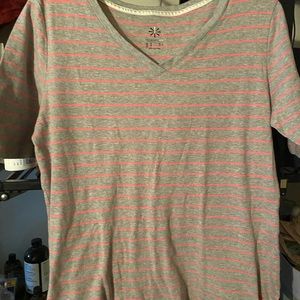 One shirt is medium beige denim and Company essentials Large , Oh the shirt is gray with pink stripes medium never Wore them just put them away in the closet