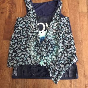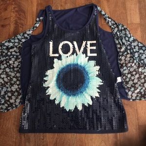 Fashionable sequin tank tops with matching shear vest. Pink Set has a beautiful flower 🌺 with the word DREAM on the front with a matching shear vest. The blue set has a flower 🌺 with the word LOVE on the front with the matching vest. 100% polyester. In Great condition no snags, fading or tears