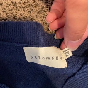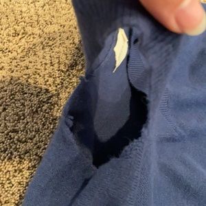 The blue one has cute in the shoulder that looked like it ripped but that is just how it was made. Red is an xl and blue is m/l