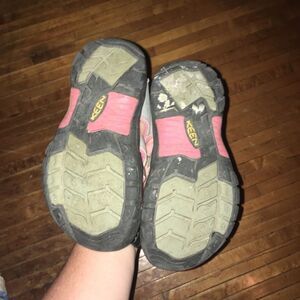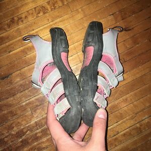 Keen gorpcore, gray and pink, athletic, sporty, closed toe sandals. N good condition. Some minor wear and paint on the side. From a pet and smoke free house. Happy to bundle!