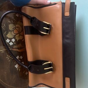Beautiful and sophisticated two-tone leather tote featuring a rich camel body with dark brown accents and gold-tone hardware. This structured design has a polished, classic look with elegant buckle-style straps and a top flap closure detail.