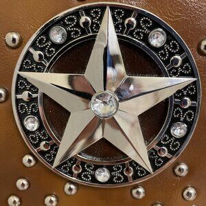 Two tone brown cross body purse with silver tone mirrored star, and studs
