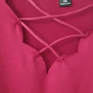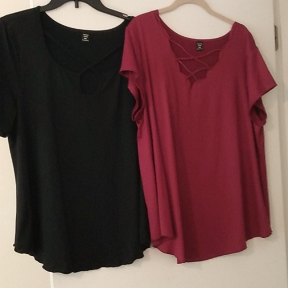 these stretchy cute v neck lace look tops great for covering your tummy. short sleeve u Hem.. in burgundy and one in black.. dress up or down these could even be used as maternity..they bit are the same size yet one has 0X.. Shein in 1x get 2 for one great price. NEVER worn. new no tags