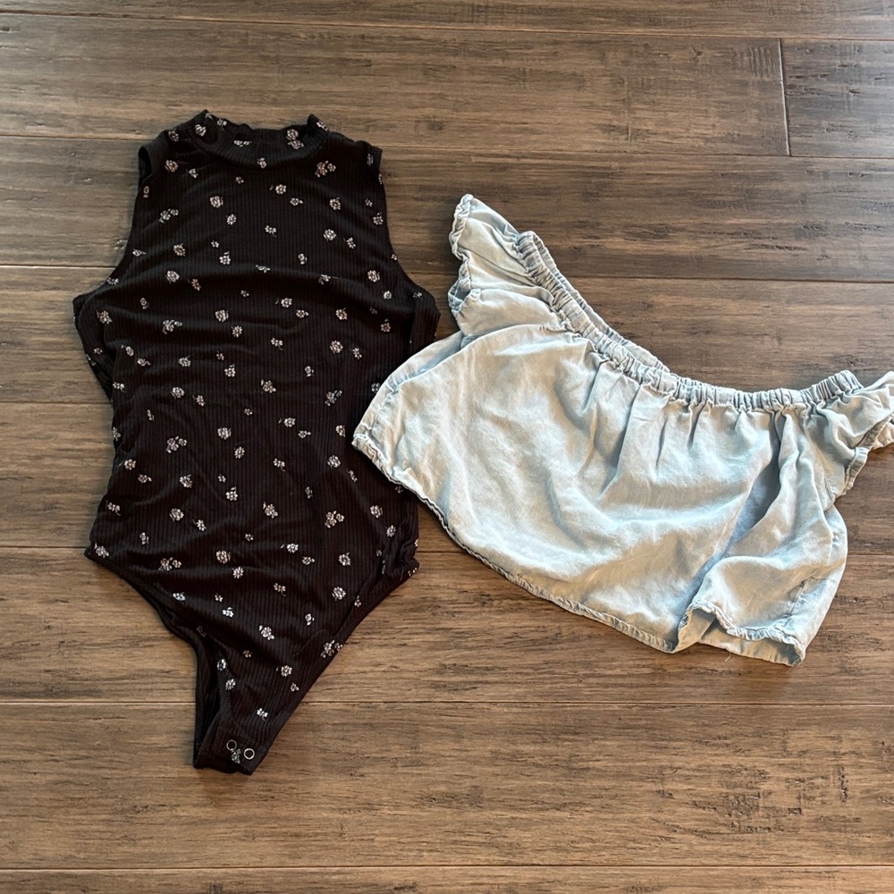 Hollister, black sleeveless bodysuit size small with little daisies on it Kendall and Kailey cropped light wash denim top size small; open back B10