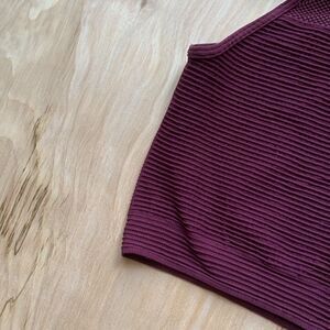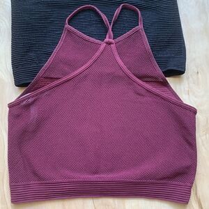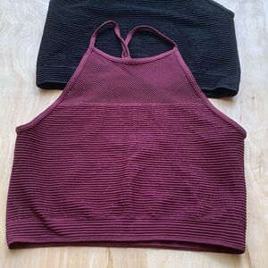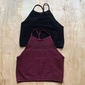 These adorable tops are burgundy and black. They have cross cross spaghetti straps. Netting at the top and across the complete back. Ribbed design on the front. Underarm flat across is 14”. Length, top of strap to hemline is 15”.