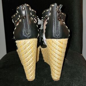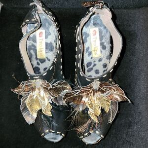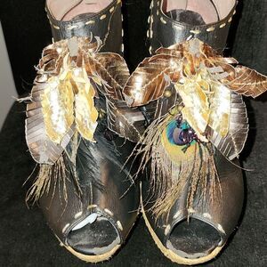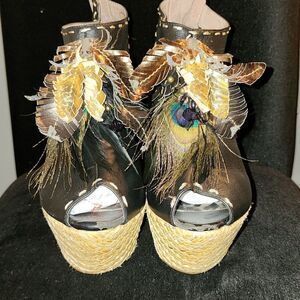 Black 5 1/2 inch peep toe wedge shoes. has tan stiching cut out sides and gold and bronze leaf detail with Peacock feathers
