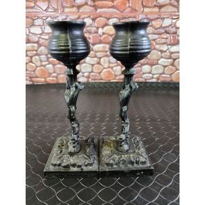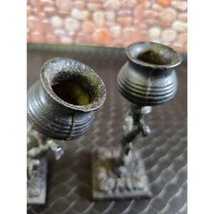 These candlesticks show some wear expected with vintage cast iron. These can easily be cleaned and shined up for someone who can clean cast iron. Be sure to zoom in on the photos because my opinion of a minor wear may not be the same as yours, although I do mention anything that visibly stands out or causes an item not to function properly.