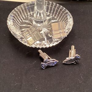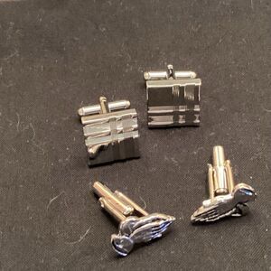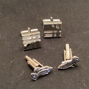 Two pair of men’s cuff links. One feature a pair of praying hands measuring 3/4” in length and 1/2” at its widest. The other pair features engraved pattern on the front and is 3/4” square. Showing front and back sides.