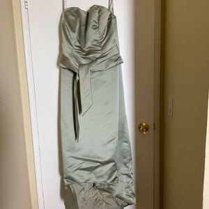 Bill Levkoff jade two-piece formal wear; strapless top (top to waist measures 14”) with belt; full length skirt (waist -14”, hip - 16”; front of skirt length - 38”; back length - 51 1/2”); flared lined skirt, size 12, polyester