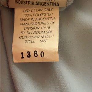 Beautiful baby blue skirt set has letter imprints on the front of the top. Skirt has elastic waist. The hem is cut in a zigzag pattern. Top: underarm across is 16”. Length is 19”. Skirt: waist across is 13”. Length is 23”. Skirt is lined.