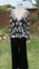 The elegant sheer black mesh top is the show stopper! White embroidery, crystal bugle beads and white pearls embellish the front and back, creating a beautiful intricate floral design. The deep V neckline is scalloped and trimmed with the same embroidery and beads. Sheer sleeves are long with a unique double bell cuff.