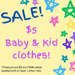SALE! Many items are being listed for $5 each. These items were previously in a children’s boutique, and a number of them were returns. All of these items are NWT, though in some cases the tag has been reattached. Please look at all images to see information about fabric and care instructions. If there is an issue with a specific item, it will be noted in an image and specified after this message. $5 items are FIRM unless bundled. Thanks, and happy shopping!