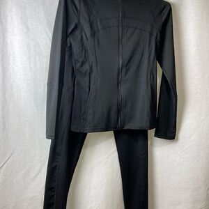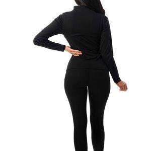 Detail: Mock neck,full zipper, mid rise leggings, side pockets, 27” inseam.