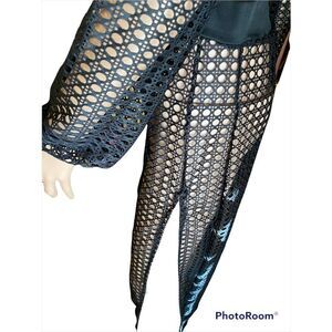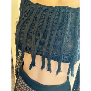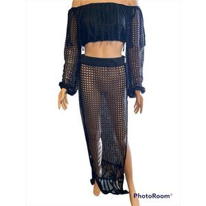 New without tags, 2 piece beach cover up long puffed sleeved cropped off the shoulder fringed top, high waisted side slit fringed hem skirt. Cutout top and bottom.