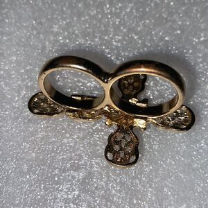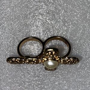 Sizes 6 and 7 this two finger filigree cross ring has faux pearls and is light weight and comfortable to wear