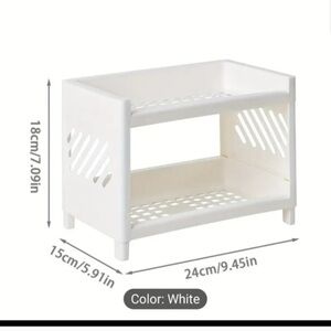Compact small two-tier storage rack in beige. Perfect for organizing small spaces. NO RIPS/FLAWS IN GREAT CONDITION! LAST PHOTO FOR SIZE