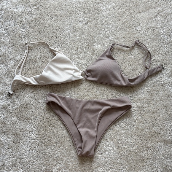 This elegant two-tone bikini set features a stylish cream and tan design, perfect for a chic beach look. Enjoy comfort and style with this must-have swimwear.