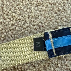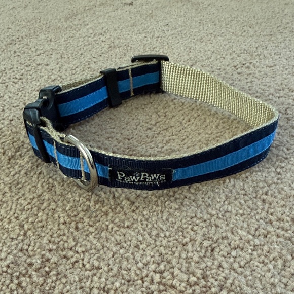 adjustable dog collar in blue and navy. Durable woven webbing with reinforced stitching. Secure plastic buckle and sturdy metal D-ring for leash attachment. Comfortable, everyday collar designed for reliable wear.