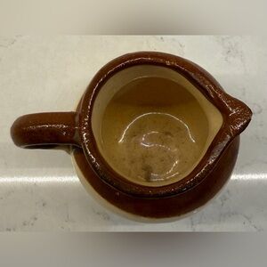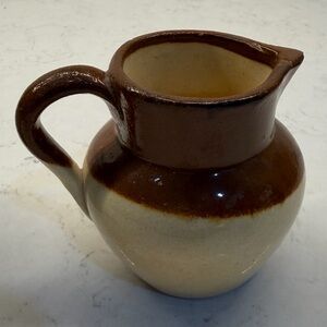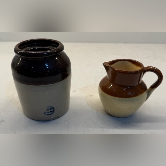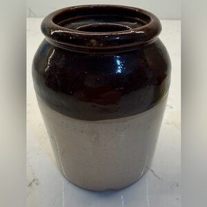 Set of two ceramic jars in brown and cream. Perfect for decor or storage. Little crock has a chip at the bottom. Pictures for details.