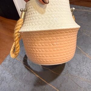 Enhance your home decor with this stylish two-tone ceramic planter. Featuring a cream and salmon design, it adds a touch of costal cool to any space. The sturdy rope handles provide a rustic charm, making it a perfect accent piece.