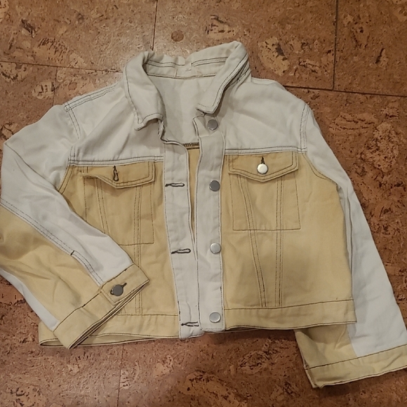 Stylish jacket featuring a two-tone design in cream and yellow. Perfect for any occasion.