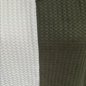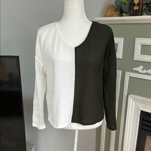 Stylish two-tone knit sweater. Features white and dark green colors. Perfect for casual wear.