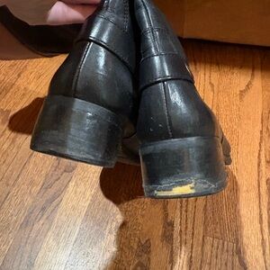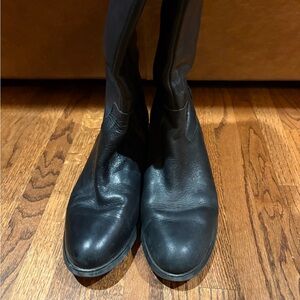 Stylish two-tone leather riding boots perfect for any occasion. Featuring a sleek black and brown design. Interior leg zipper. Really comfortable. Slightly worn on the back of the right heel (as shown in photos).