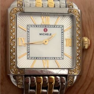 Elegant two-tone Michele watch with a rectangular face. Features a mix of silver and gold tones.