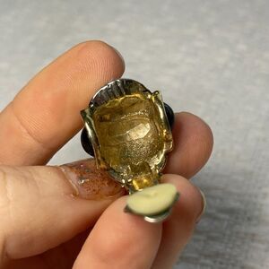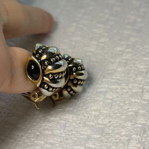 Two-tone gold and silver ribbed hoop clip earrings with black stones on the sides. No markings.