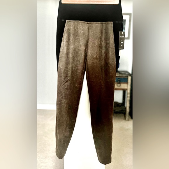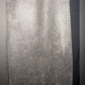 The distressed worn color is a hit. The black fabric details around waistband and hip area. Material has stretch.