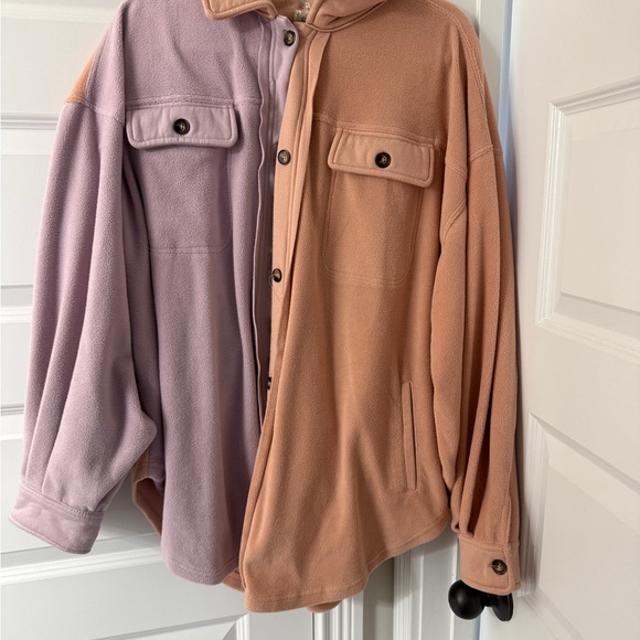 Two toned fleece shacket with lavender and peach tones. Features buttoned pockets. Ideal for layering.