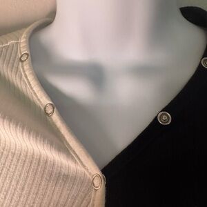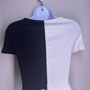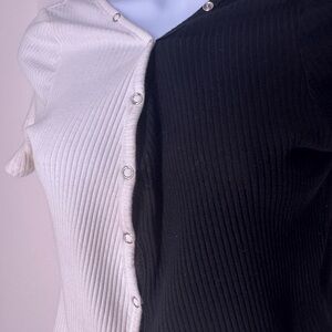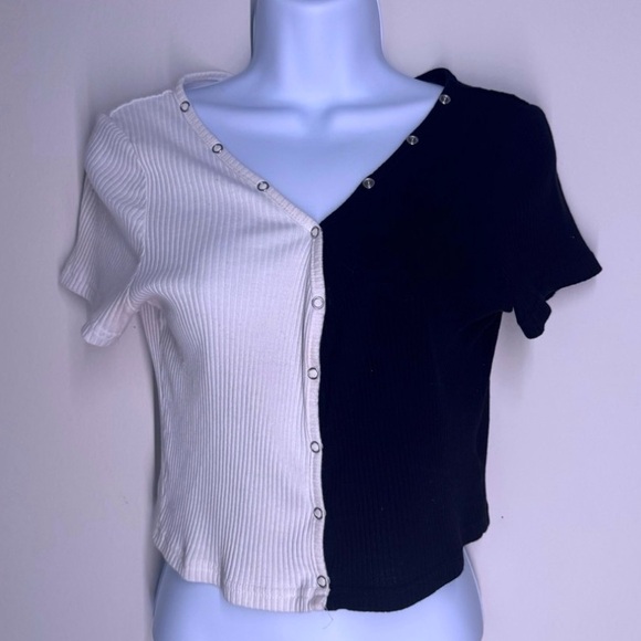 Edgy and bold ribbed short sleeve tee featuring a striking black and white split colorblock design. Finished with snap button front detail for an extra Y2K, alt vibe.