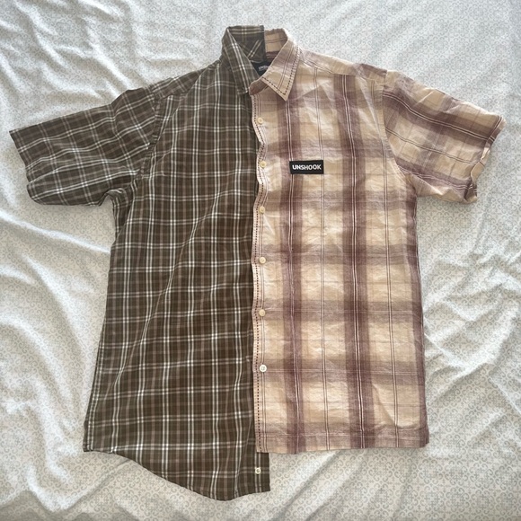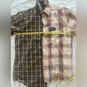asymmetric unique reworked two-toned plaid button up! originally purchased from Unshook at Kobey’s Swap Meet. tagged as medium with 21.75 inch pit to pit. measurements for each side shown.