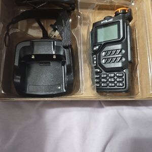 Two-way radio in a brown kraft retail box. Clear "Radio" logo on the lid. Compact packaged unit ready for sale. Multi band, weather radio, FAA, 5 to 10 mile range. Antenna is missing was not in box when I received it unopened. Replacement Antenna cost approximately 10$ or less.