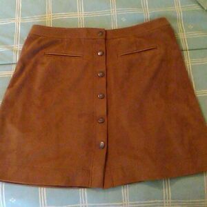 Cute faux suede mini with all the sass and none of the care. Fully lined. Snap front. Size 2 measures 30 at waist, 42 at hips, 16.5 long from waistband to hem.
