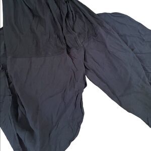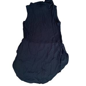 Two by Vince Camuto black sleeveless blouse with cowl neck and contrasting materials. bottom half is a shiny rayon material with high open side slits shown in 3rd photo.