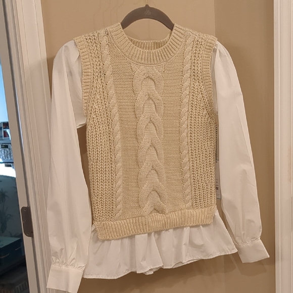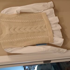 this is a great shirt it looks like a sweater vest but it's all one piece white shirt long sleeves as you can see, The vest is neutral color and the underneath blouse is white