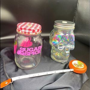 I call this the “Dr. Jekyll and Ms. Hyde” drink jar set being that one is a skull glass jar that could depict the darker or heavier side of one’s mood and the other is a Sugar & Spice jar that could depict the sweeter and softer side of one’s mood. Just thought it’d be fun to pair these two up. Lids intact with seals but w/o straws