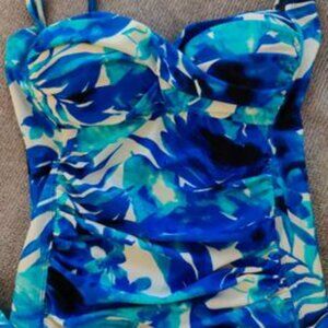 The tankini is a two-piece swimwear set featuring a vibrant blue and white floral pattern. The top is a tank-style design with adjustable straps for a comfortable and customizable fit. It offers modest coverage with a slightly loose, flowy fit around the torso, allowing for ease of movement.