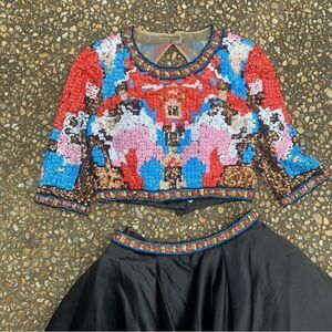 Absolutely adorable two piece set with all over beaded “trophy” style cropped top and full Circle black satin mini skirt with matching beading. Marked size 2. Worn one time. (A few lost sequins as pictured but no one will ever know 😉).