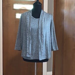 This listing is for both the tank and the open front cardigan from rafaella. Size medium petite. In excellent used condition. The tank is heather gray with hints of black and white in the knit, high neck, and has studded embellishments around the neck line. The cardigan is the same material, long sleeved and has studs along the sides of where it hangs open.