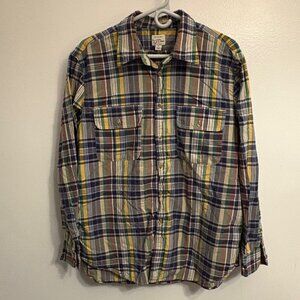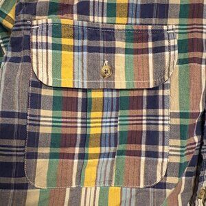 Two-pocket workshirt in Indian madras by J.Crew. Size Large. Vintage-inspired, comfortable, extra-light fabric, 100% cotton, point collar, patch pockets. Machine wash.