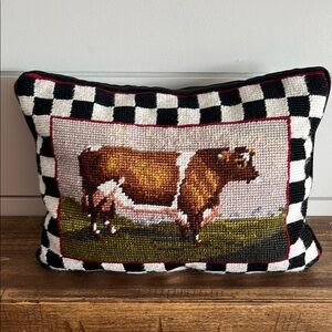 Decorative pillow with a cow needlepoint design. Features a black and white checkered border. Measures 11x9 inches.